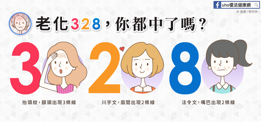 其次,容易出現的老化現象,就是整形外科常提到的臉部「老化328」。劉醫師說,所謂的3,就是一般人出現的抬頭紋,會在額頭出現明顯的3條線;2就是當一般人皺眉時,眉間出現類似川字的2;而8就很容易猜了,就是位於嘴邊的法令紋;劉醫師說,這幾種皺紋,都是一般人老化最容易出現的紋路。