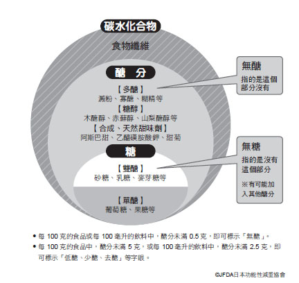 另外,請注意醣分和糖是不一樣的。醣分是指各式各樣的醣,而「糖」是指雙醣類(砂糖、乳糖、麥芽糖)或單醣類(葡萄糖、果糖)。請參考下一頁的圖,記下「碳水化合物>醣分>糖」就好。