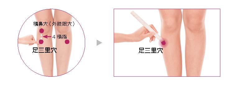 取穴:膝關節彎曲成直角,足三里穴在外側膝蓋骨下方的凹陷,往下4橫指處。