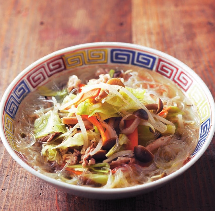 將中式麵條換成冬粉,再加上富含膳食纖維的蔬菜及菇類,以及燃燒脂肪必備的蛋白質,就是一道營養均衡的料理。