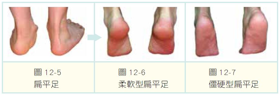 由於肥胖、懷孕、老化或腳底肌力衰減等原因,造成內側足弓的結構坍塌,使足底弧度變平,呈現扁平的外觀而被稱為扁平足(圖12-9);扁平足患者並不會立即感到不舒服,甚至有些人從未感到不適。