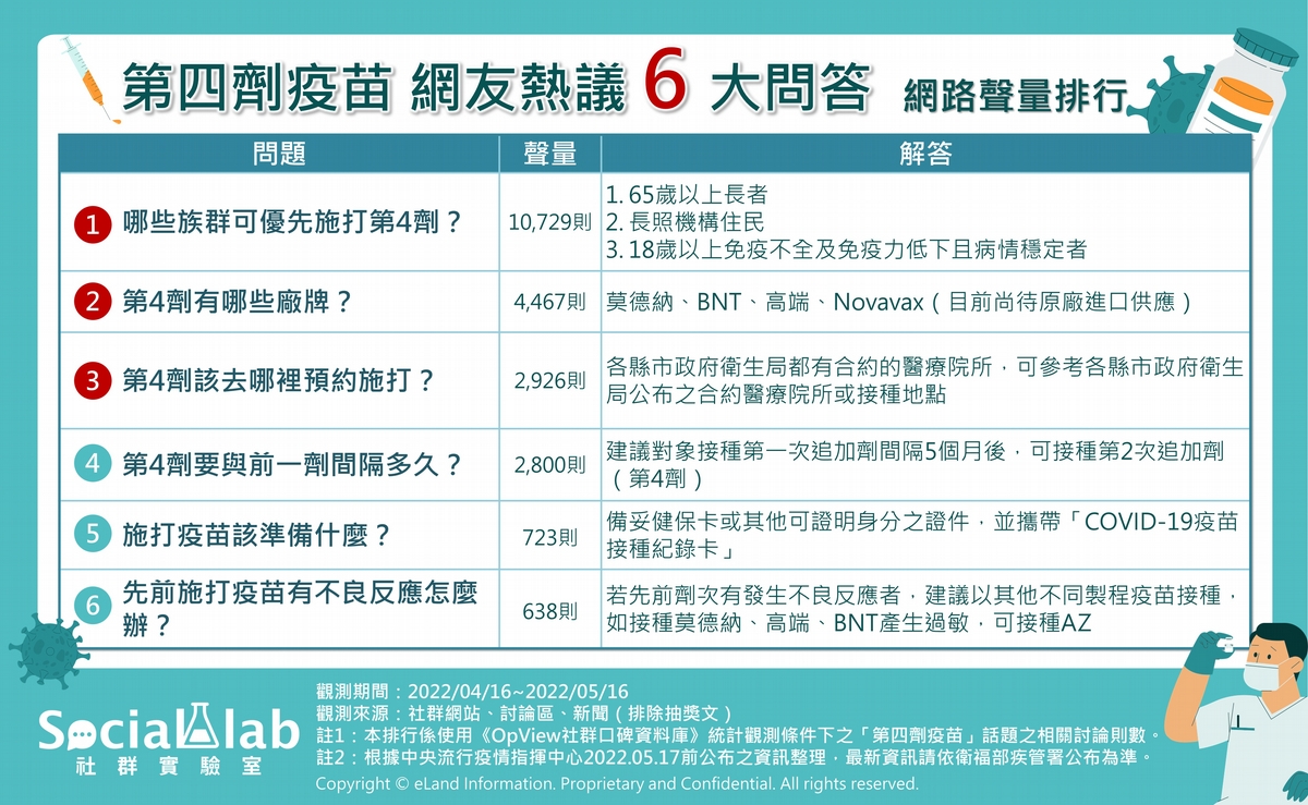 疫情急速升溫,想趕緊打疫苗的你也有很多問題想問嗎?根據《Social Lab社群實驗室》統計並排行最近1個月的社群討論聲量,發現民眾最關心的第4劑疫苗相關疑問如下: