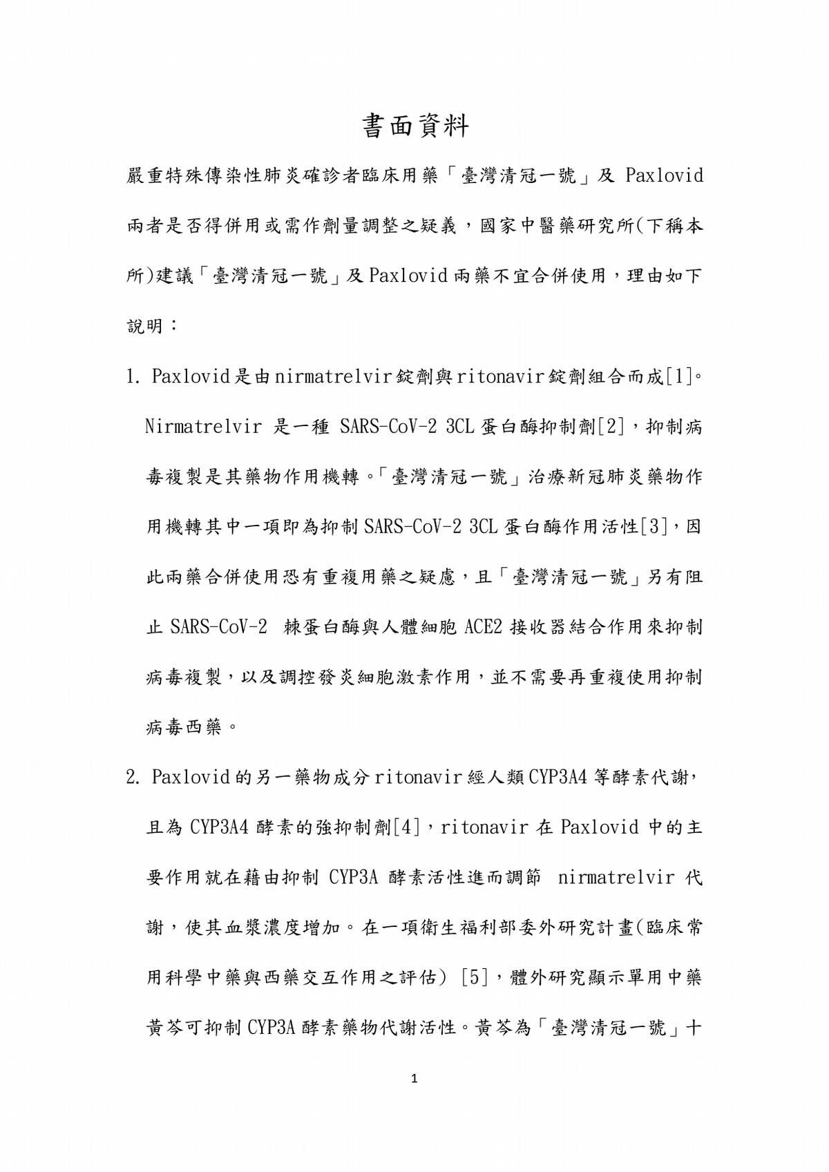 根據國家中醫藥研究所函覆書面資料,清冠一號與Paxlovid不宜併用的主要原因為: