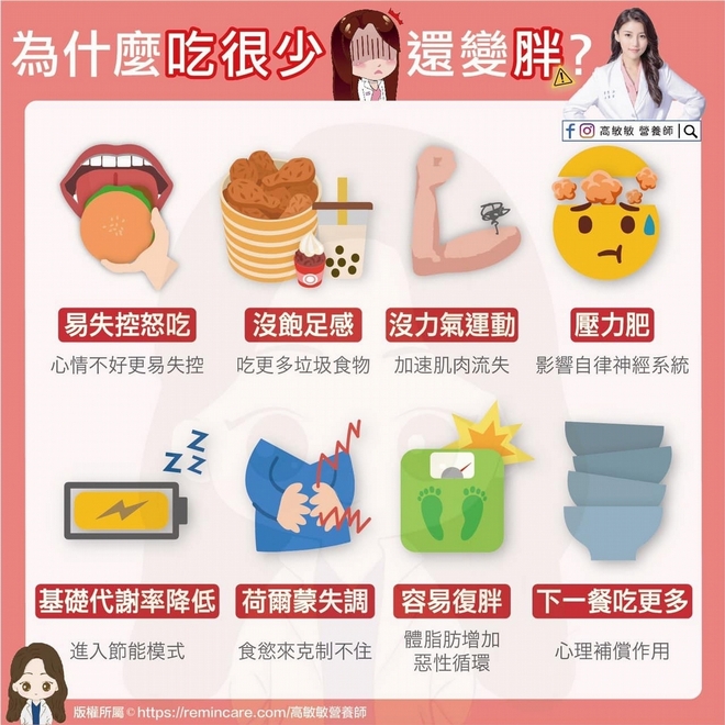 - 荷爾蒙失調:吃太少會影響腸胃或脂肪等荷爾蒙分泌,導致食慾來時克制不住。但還有一種是荷爾蒙失調,就是即便有運動和飲食管理,卻依舊變胖,這或許是荷爾蒙出問題了,建議盡快就醫喔!