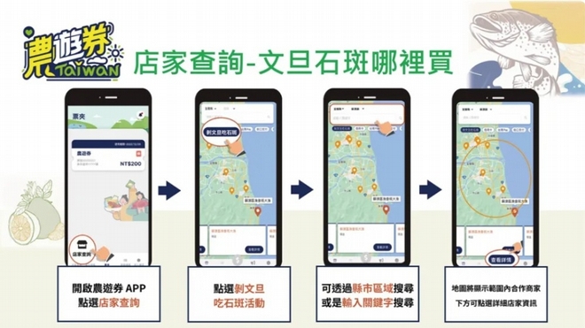 實體門市:農遊券官網>去哪裡消費,查詢活動店家「剝文旦吃石斑」。