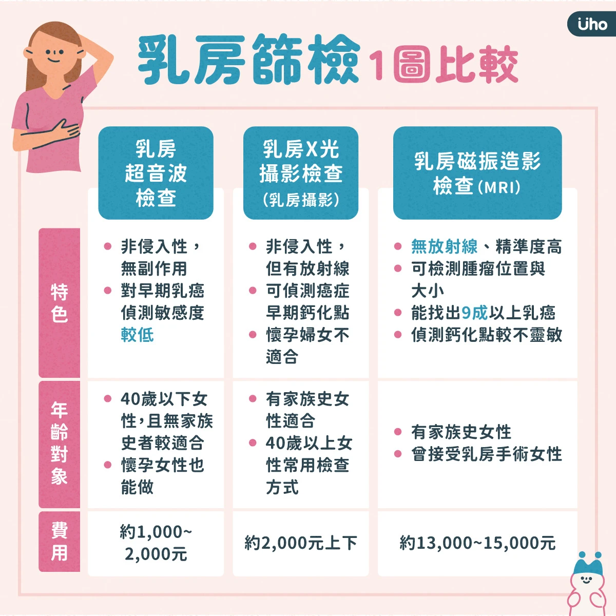 常見乳房檢查有3種:超音波檢查、X光攝影檢查以及乳房磁振造影檢查,分別適用不同的族群,建議民眾可依照年紀、家族史、是否懷孕等因素,來選擇適合自己的檢查: