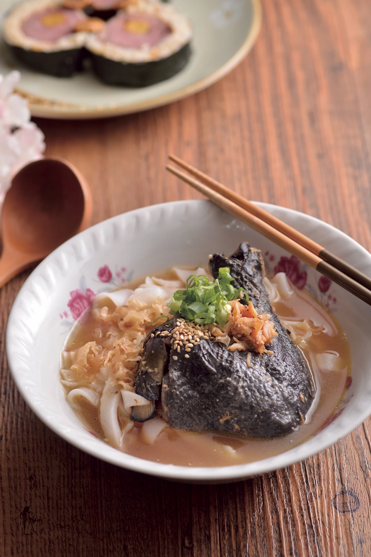 這道米干來自故鄉中壢的龍岡,運用烏骨雞熬製湯頭,因為其脂肪與熱量比一般肉雞低,富含蛋白質與鐵,適合產後坐月子增強體力、補血,透過高壓燉煮烏骨雞中的鈣質萃取出來,平時也可以當湯品食用。