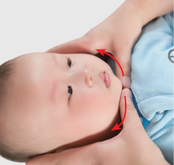 - 將兩手從前額髮際按摩到耳後,注意避開前囟門,滑到耳垂下方,在耳垂後面停一下。
