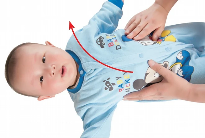 - 將左手從幼兒的右下腹按摩到左下腹。