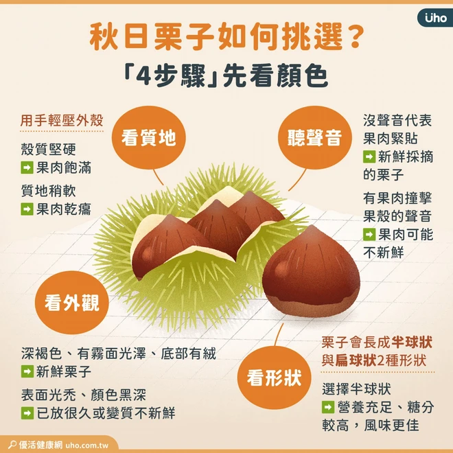 - 看質地:用手輕壓外殼。若殼質堅硬表示果肉飽滿;若質地稍軟表示栗子果肉乾癟。