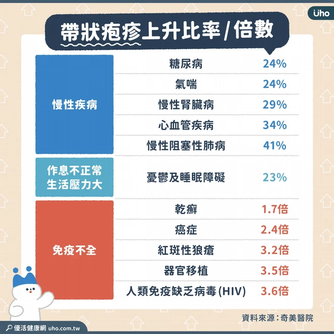 針對慢性疾病、作息不正常壓力大及免疫不全者等3類人,李茂庭也提供下列「1表」對照,看懂罹患帶狀疱疹的上升比率及倍數: