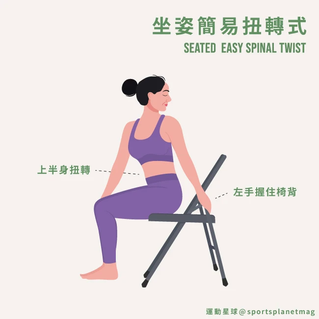- 上半身向左扭轉,左手握住椅背,右手放在左膝上或椅背上方,脊椎保持挺直。停留 5~10個呼吸。