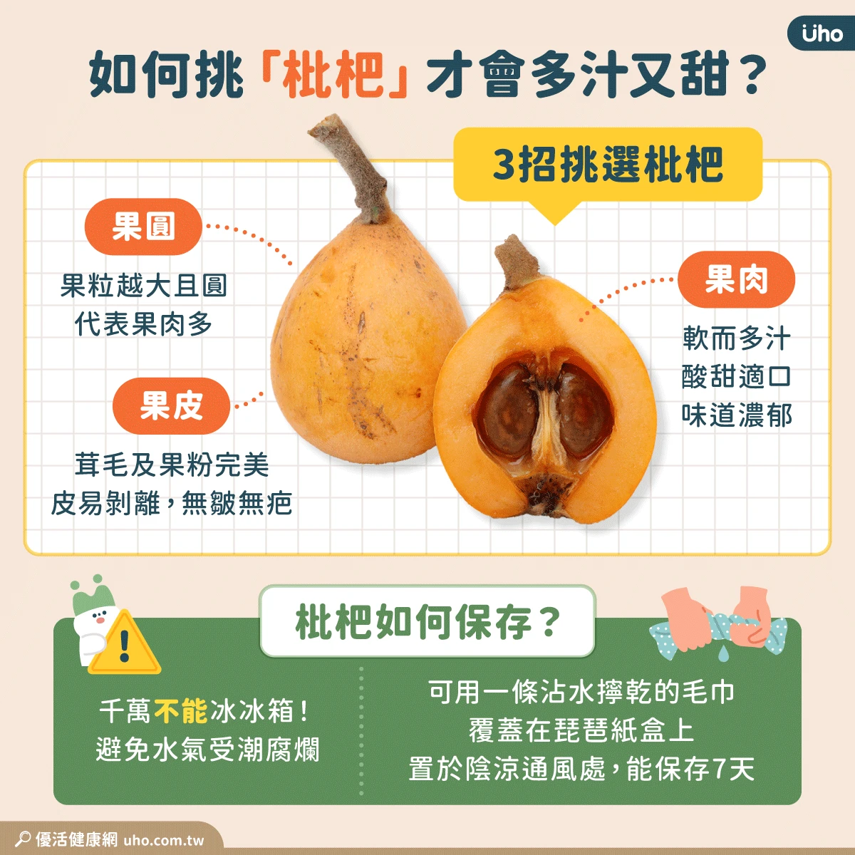 市面上的枇杷有很多,如何才能挑到好枇杷?建議可以從外表開始,若枇杷果粒大而完整,色澤濃且均勻,且無疤痕即過關。枇杷的品質好壞,則可從口感評鑑,吃起來口感綿密即上品;若口感僵硬,咀嚼時還會發出聲音,則品質不佳。《優活健康網》整理以下簡單的挑選技巧: