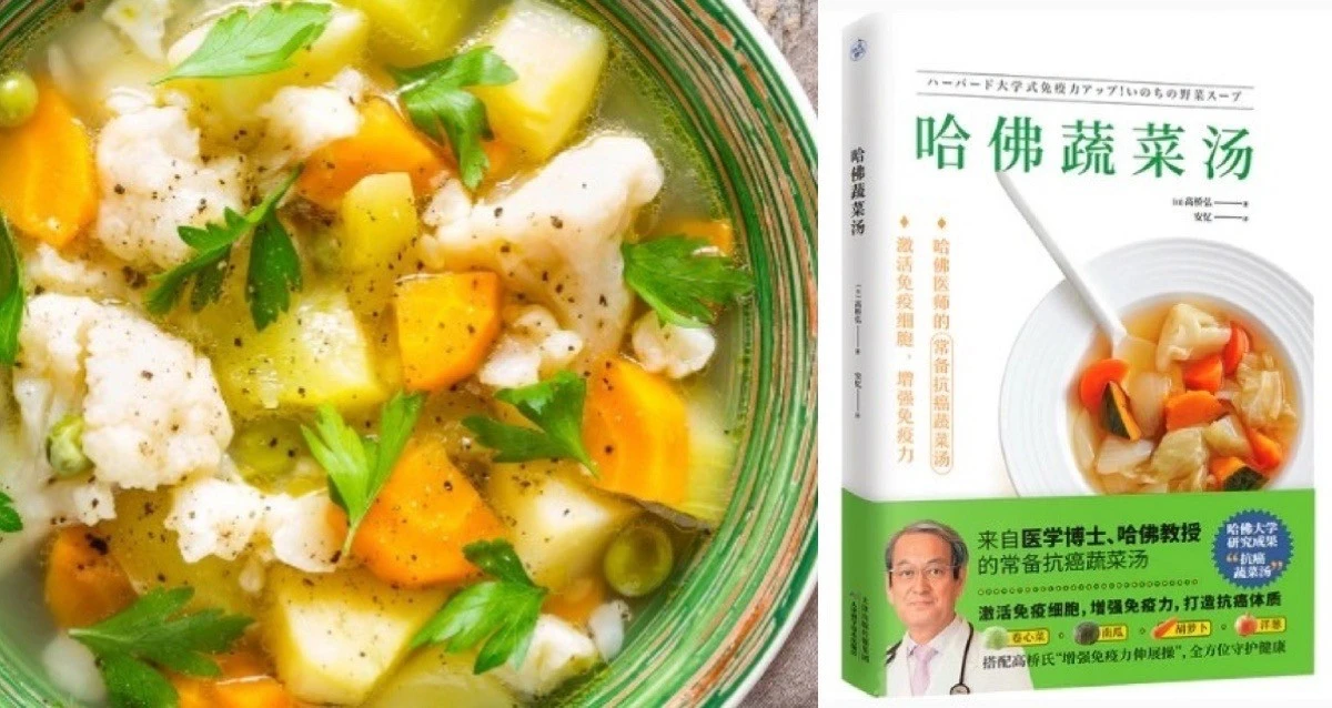 哈佛蔬菜湯是由日本醫師高橋弘研究出的蔬菜湯,食譜由四季都能輕易取得的食材,包括高麗菜、洋蔥、紅蘿蔔及南瓜組成。由於高橋弘長年在哈佛大學留學,並致力研究癌症與免疫功能,同時在國際頂尖期刊發表過許多論文,他就經常鼓勵自己的病人,日常保養多喝喝這碗蔬菜湯來進行食療。