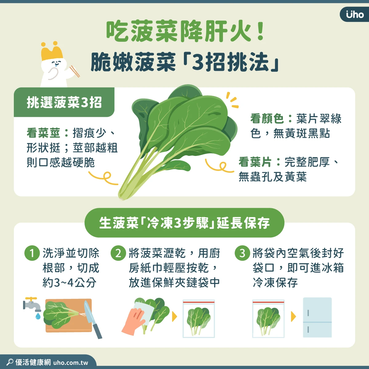 菠菜一年四季都吃得到,其營養價值高,含有維生素A、維生素C、維生素E、葉酸、草酸、鐵等多種維生素和礦物質,因此也有「蔬菜之王」的稱號。開業診所院長內科專科醫師傅裕翔於臉書粉絲頁分享菠菜「4大好處」提供參考: