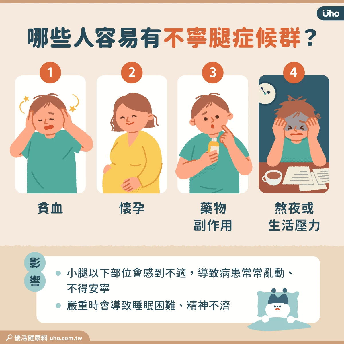 他指出,不寧腿發作時,通常是小腿以下部位會感到不適感,導致病患常常容易亂動、不得安寧。這種疾病嚴重時會導致睡眠困難,隔天精神疲倦,長期累積下來會影響到情緒、社交及工作表現。
