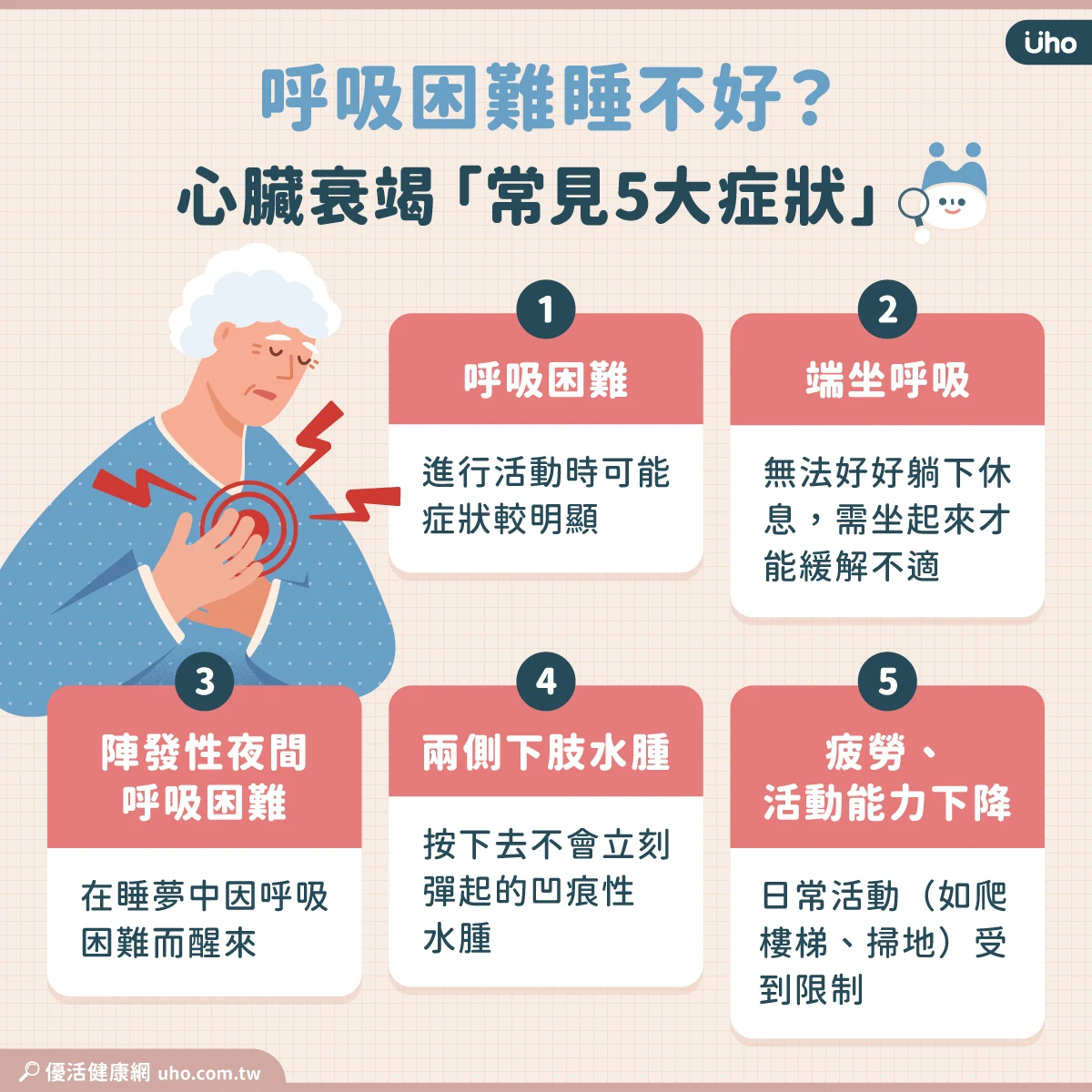 - 端坐呼吸:心衰竭的典型症狀,患者會無法好好躺下休息,需要坐起來不適才能比較緩解。