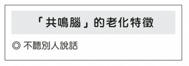 這兩個區域的活動減弱,就會導致共鳴腦老化。順帶一提,客觀判斷腦與共鳴腦衰退的人,具有易怒、經常抱怨、變得固執、執著於過去等特性。