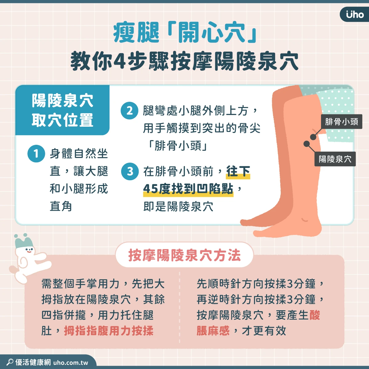 - 在腓骨小頭前,往下45度找到凹陷點即是陽陵泉。