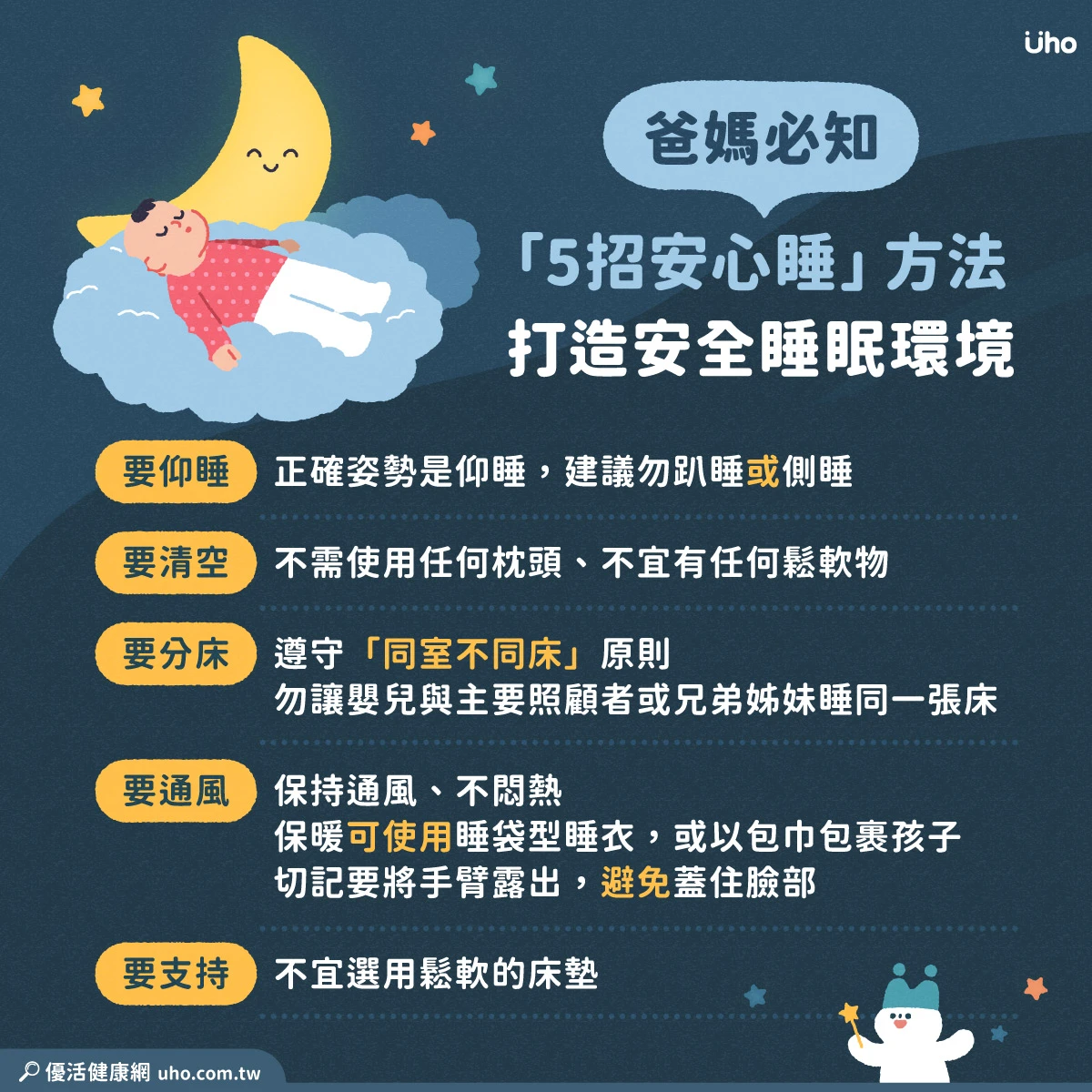 因此,彭純芝呼籲家長應遵守以下「5招安心睡」方法,打造安全睡眠環境,為寶寶安心睡眠把關: