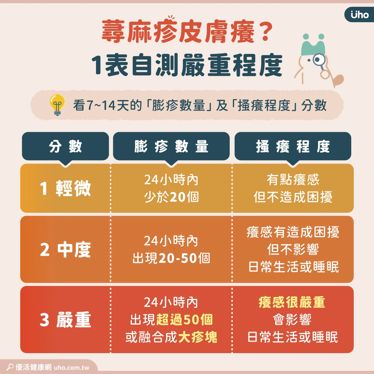 而慢性蕁麻疹患者該如何評估自己的症狀有多嚴重?陳怡行建議,可使用國際通用的「UAS7蕁麻疹檢測表」,自我評測7到14天的「膨疹數量」及「搔癢程度」分數,了解自己的症狀程度是屬於輕微、中度還是重度: