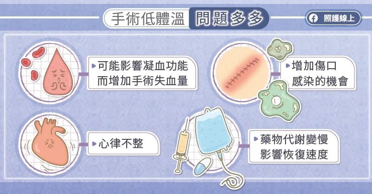 「手術低體溫」絕對不單純是患者主觀「會很不舒服」這樣的問題而已,而是非常重要的病人安全議題,郭書麟解釋,因為大量的實證醫學研究都證實,手術低體溫與凝血功能有關。當體溫過低,患者便無法維持正常的凝血功能,使術中出血量增加。