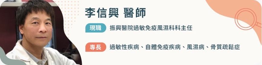 振興醫院過敏免疫風濕科科主任李信興醫師表示,骨頭就像是房子的鋼樑,隨著年紀增長、女性停經、慢性疾病等因素慢慢變得疏鬆,長期服用類固醇的病患骨質流失速度更快,骨頭會像鋼樑變薄,承受不住倒掉就導致骨折。