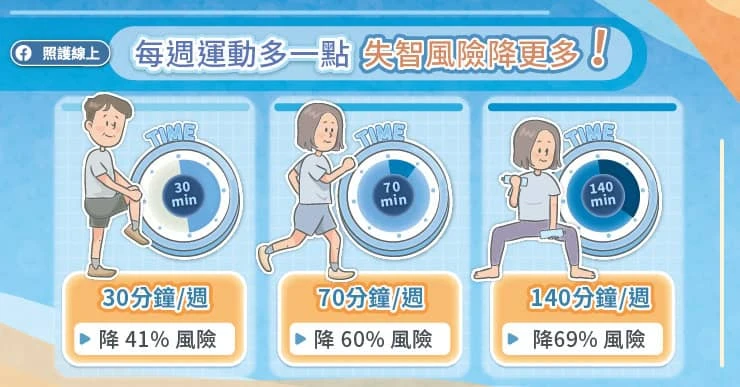 - 每星期中度運動至劇烈運動的時間36到70分鐘,降低60%的失智風險。