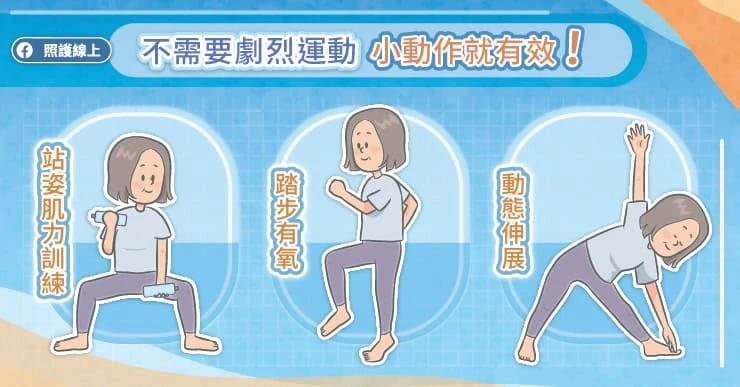 - 站姿肌力訓練:鍛鍊大肌群有助於維持肌力與平衡,對行走穩定度與減少膝蓋痛也很有幫助。你可以試著用深蹲、弓步蹲、或屈膝禮弓步等方式訓練肌力。