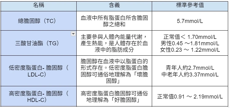 血脂檢查主要關注這4項:膽固醇(TC)、三酸甘油酯(TG)、低密度脂蛋白膽固醇(LDL-C)、高密度脂蛋白膽固醇(HDL-C)。