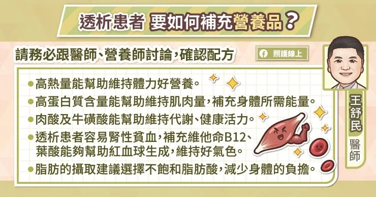 王舒民建議,透析患者可以選擇高熱量、高蛋白質含量、富含肉酸及牛磺酸、維他命B12、葉酸的營養品。「由於透析患者容易出現腎性貧血,可能影響生活品質、增加住院及死亡率,建議補充維生素B12、葉酸,幫助紅血球生成,維持好氣色。脂肪攝取責建議選擇不飽和脂肪酸,減輕身體的負擔。