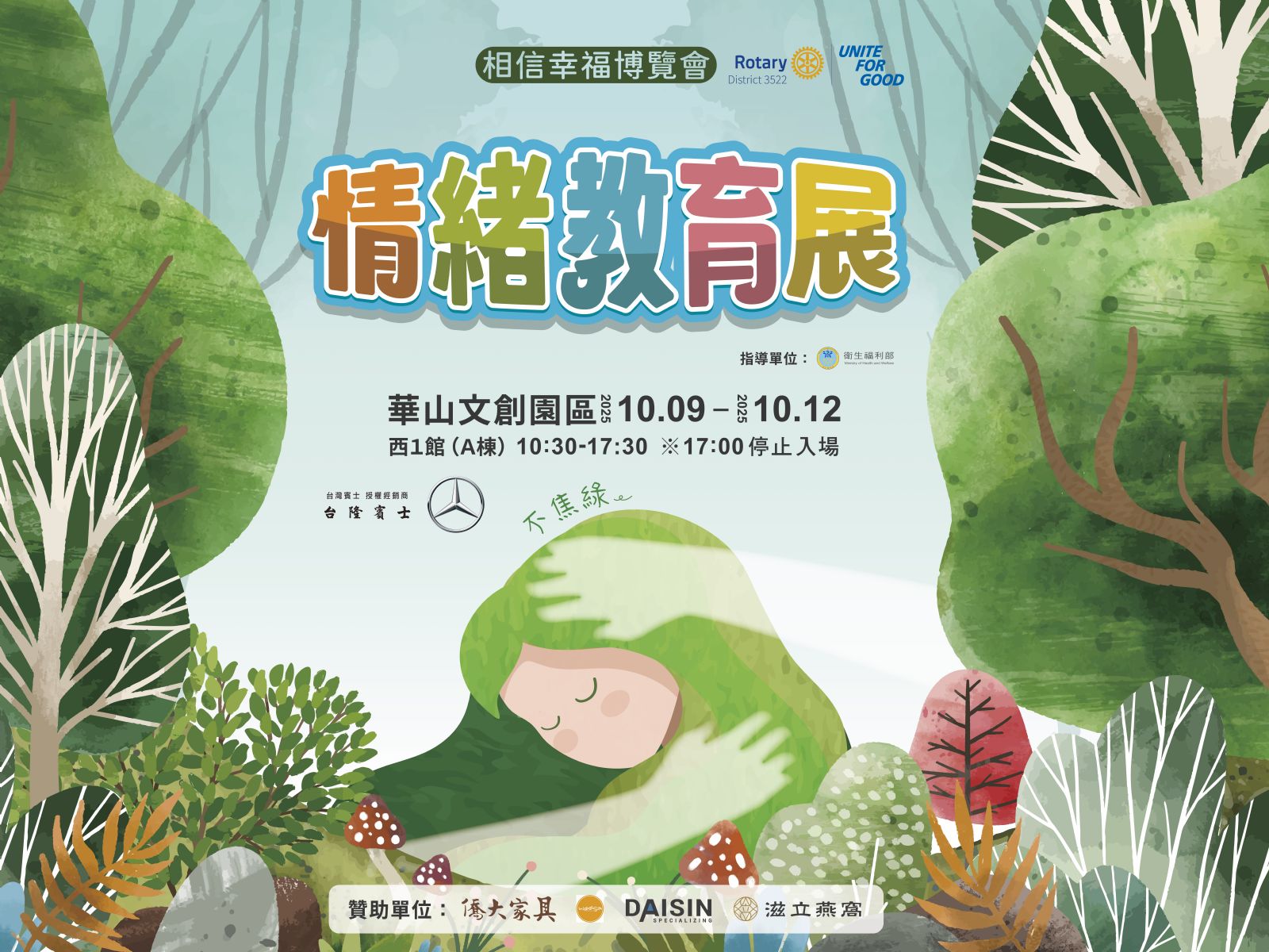 衛福部最新統計,自殺再次重返十大死因,並且在青壯年族群中高居第二位,顯示心靈健康已成為公共衛生與社會安全的重大挑戰。由國際扶輪3522地區共同主辦的「國際扶輪3522地區25-26年度幸福博覽會-情緒教育展」以「幸福森林」為主題,將於10/9(四)至10/12(日)在華山紅磚六合院 西1館登場,邀請社會各界一起為自己的情緒策展、也為彼此留下一盞光。