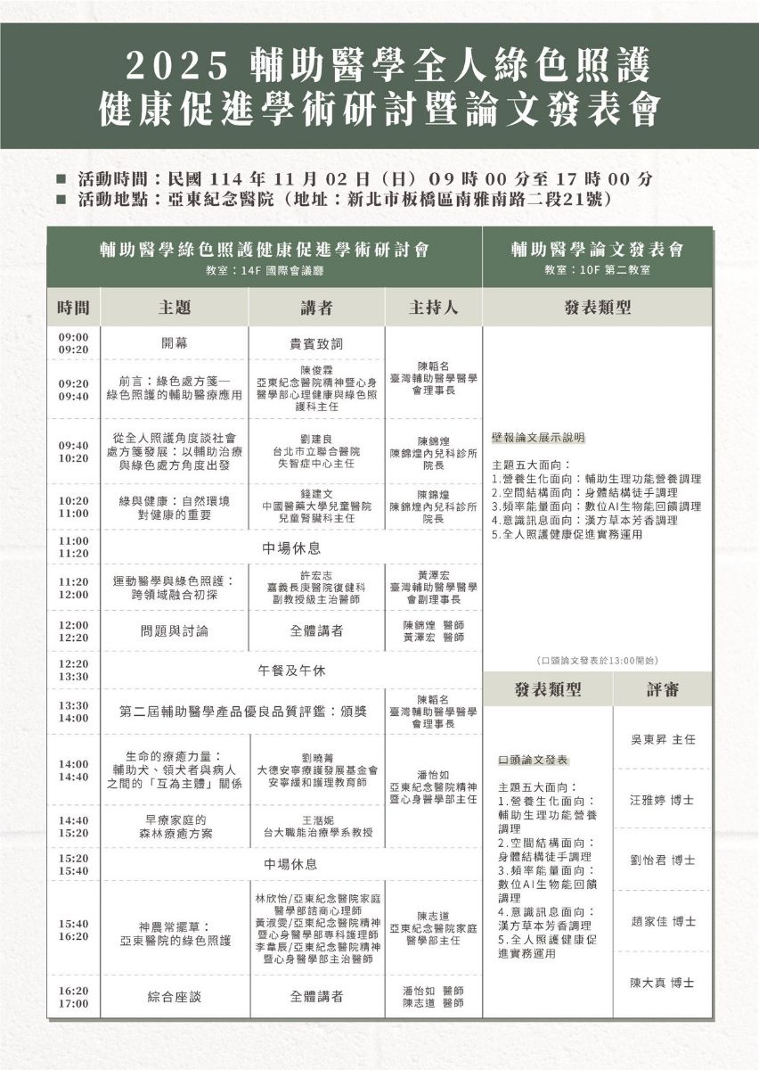 一場別開生面、與我們每個人都息息相關的健康盛會,「2025 輔助醫學綠色照護健康促進學術研討會」,即將在2025年11月2日(星期日)於亞東紀念醫院盛大舉行。這不只是一場嚴肅的學術會議,更是一次探索如何運用大自然的力量來促進身心健康的奇妙旅程。