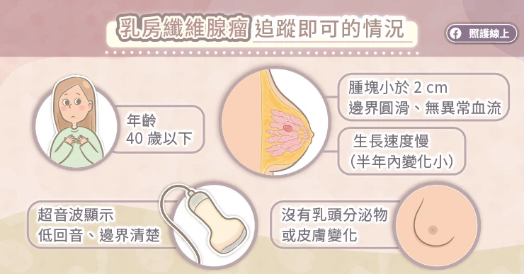 如果屬於不需要開刀的患者,也別忘了定期半年至1年就要做1次乳房超音波檢查,持續確認乳房腫瘤是否出現變化!