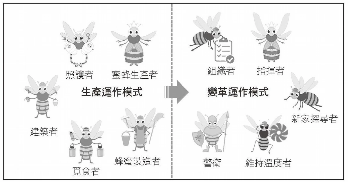 尋找新家的蜜蜂知道,如果要成功通過瞬息萬變的叢林,牠們就得建立起新的運作模式。成功於否,取決於能否用「變革運作模式」取代「生產運作模式」。在每一種運作模式中,群體的成員都有各自的角色。蜂群的生產運作模式包含下方的角色: