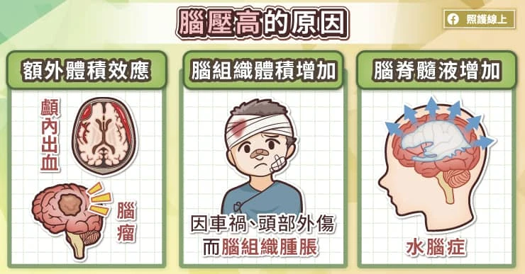 - 腦組織體積增加:例如當因為頭部外傷、腦炎、低血鈉、尿毒性腦病變等原因,導致腦部組織腫脹,體積就會讓腦壓上升。還有就是當顱內出現了額外的血塊(顱內出血)、腫瘤(腦瘤)、膿瘍等體積,就會增加腦壓。