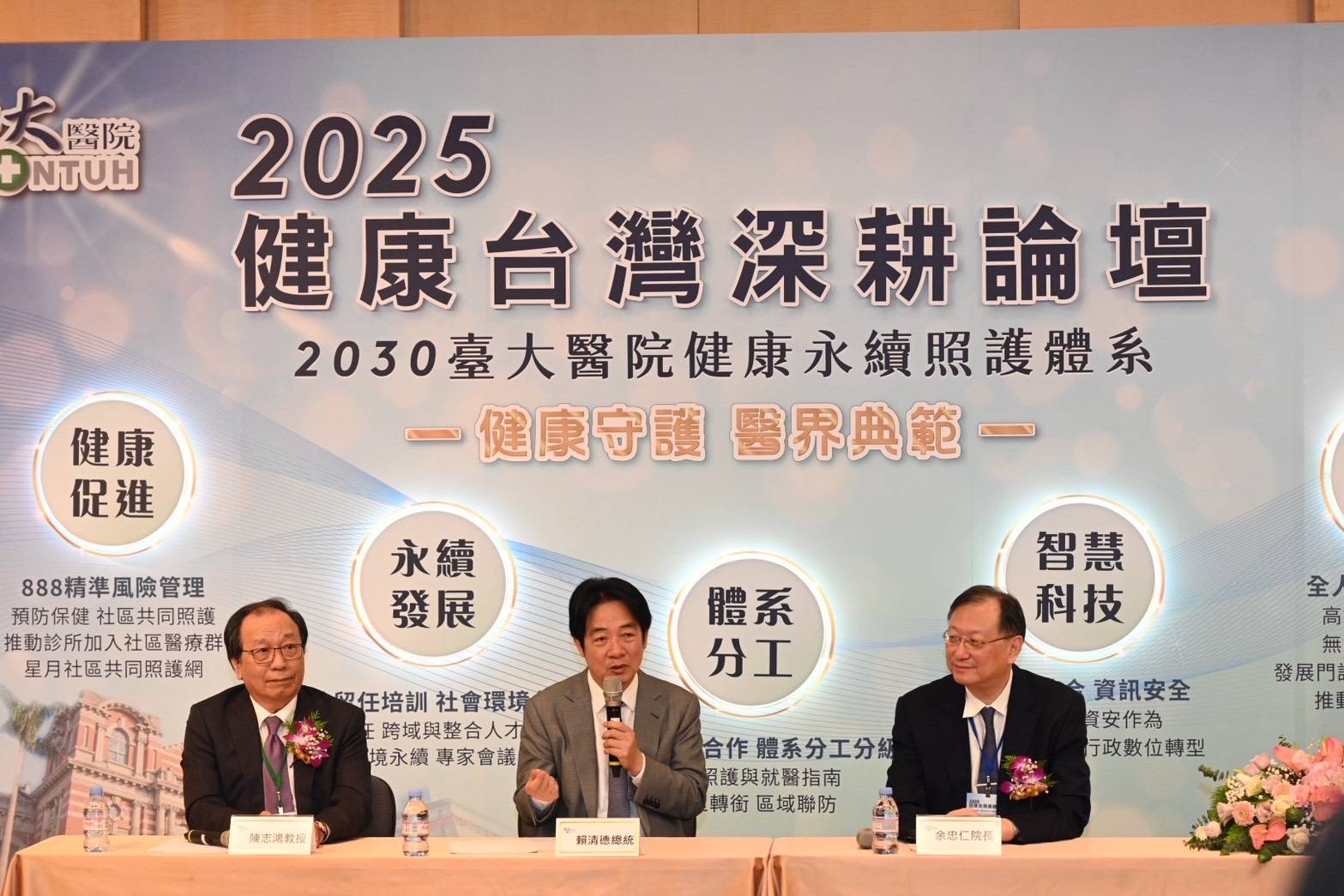 為呼應政府「健康台灣」國家願景,臺大醫院於2025年11月16日舉辦「健康台灣深耕論壇」,特別邀請賴清德總統蒞臨現場致詞期勉,並集結國內醫政領袖、政策制定者及跨領域專家,共同探討我國醫療永續、人才培育、智慧科技醫療、社會責任等關鍵議題,凝聚推動健康台灣的共識與能量。論壇由臺大醫院院長余忠仁開場致詞,並由衛生福利部部長石崇良說明「韌性永續 健康台灣」的國家健康政策方向,健保署署長陳亮妤以「健保 30:挑戰與展望」分享制度變革契機,國健署署長沈靜芬則強調「健康台灣 全民參與」的重要性,最後為健康台灣深耕論壇總召集人陳志鴻教授進行「健康台灣深耕計畫國政願景」特別演講,由中央及醫療體系代表,從政策、制度與臨床面向提出前瞻見解,聚焦全民健康與醫療永續發展。