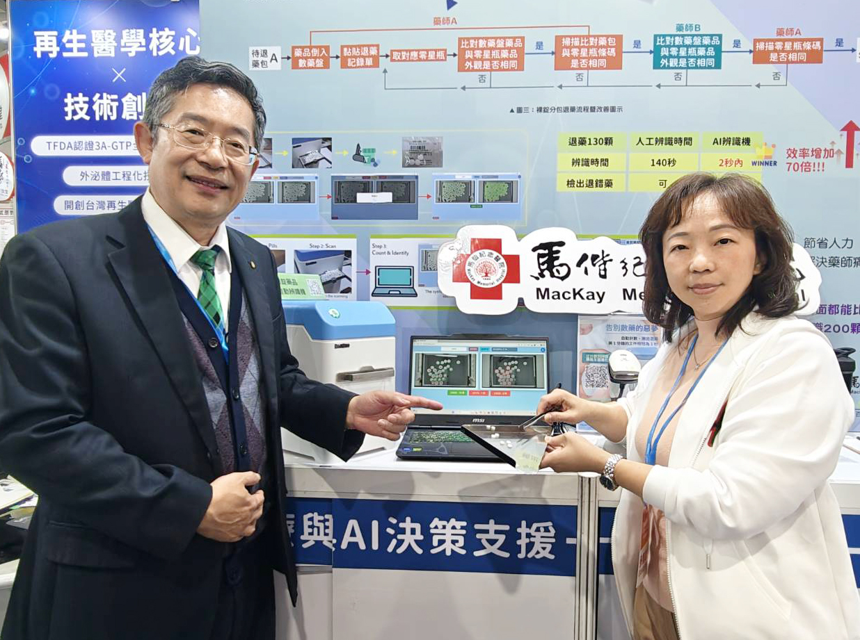 圖/馬偕紀念醫院總院長張文瀚(左)與陳智芳主任於科技展展示裸錠藥品AI辨識機。