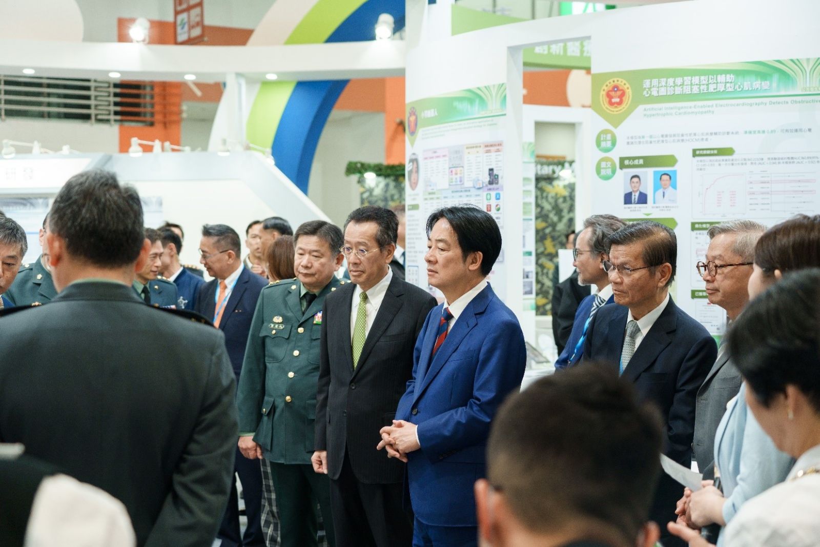圖/中午總統賴清德先生由生策會翁啟惠會長、吳明發先生陪同蒞臨國軍醫療體系展區,對國軍醫療科技發展高度重視與支持,由海軍常務次長黃中將、軍醫局局長蔡中將及政務辦公室主任孫中將帶領軍醫同仁歡迎與合影,並介紹「生物致病原檢測晶片及微流體晶片測定儀」主題,彰顯國軍在醫療科技與軍陣醫學發展上的卓越成果。