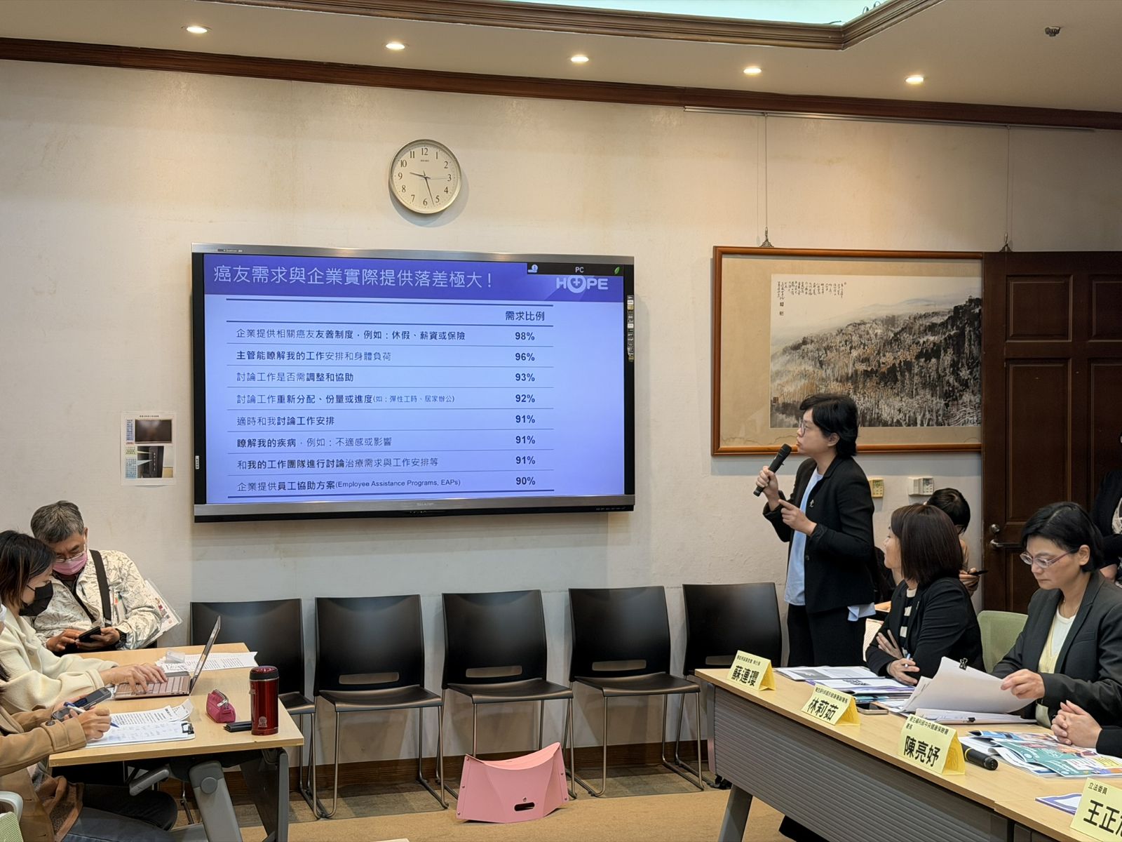 勞動權益專家劉梅君教授也指出,現行勞動政策多停留在鼓勵企業讓員工進行政府癌症篩檢,但對罹癌員工支持顯然不足。事實上,罹癌員工治療期間仍希望維持工作,但缺乏法規指引,使企業與主管在工時、工作內容、休假安排上無所適從,導致癌友權益難落實。她建議政府鼓勵企業制定並公開癌友友善制度,明確界定法定義務與建議措施,使「治療與工作平衡」成為可行、可持續的模式。