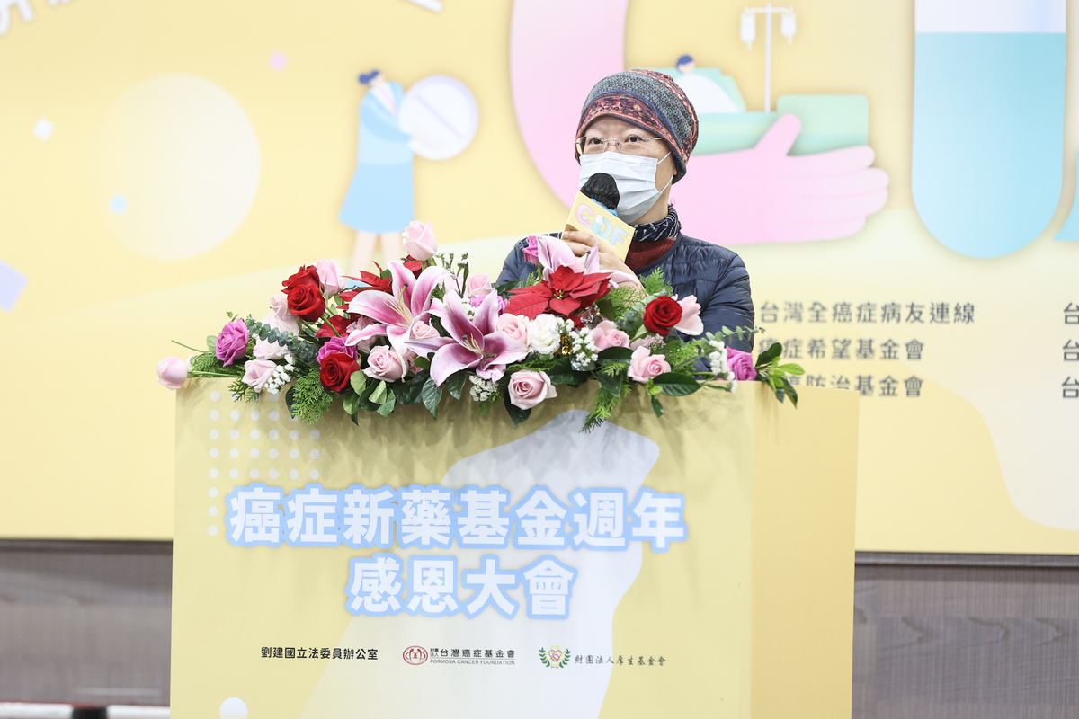 圖/病友代表小君感謝政策的支持,讓她能夠在對的時間使用正確的治療,大幅降低後續疾病照護的負擔。(台灣癌症基金會提供)