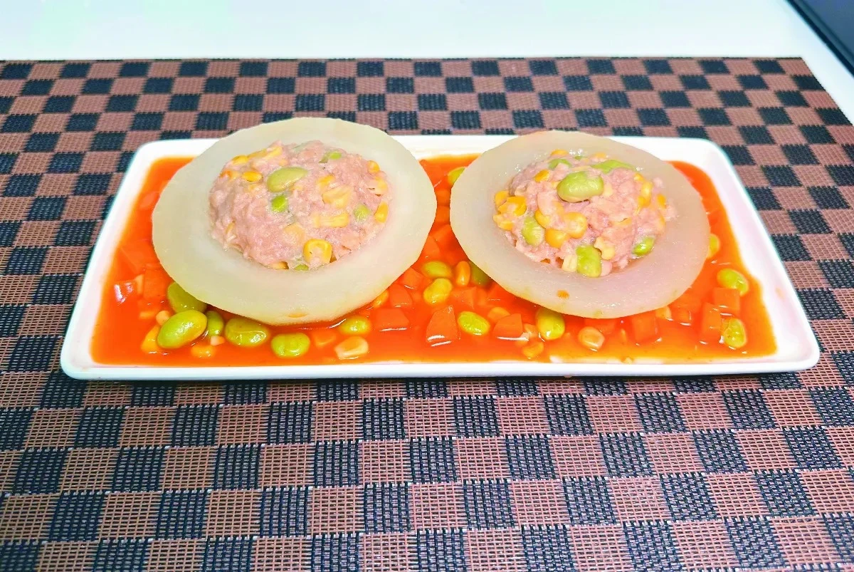 冬瓜、植物肉、毛豆、玉米粒、紅蘿蔔丁、甜辣醬(或味噌辣醬)、薑末、太白粉