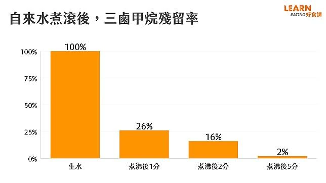 結果發現煮沸1分鐘時揮散約74%,而在煮沸2分鐘時可揮散84%,煮沸5分鐘後則可以揮散到98%。代表以台灣人的煮水習慣應該可以大幅降低飲用水中的三鹵甲烷問題。但是,這還是要經過風險評估才知道是否具有危險。