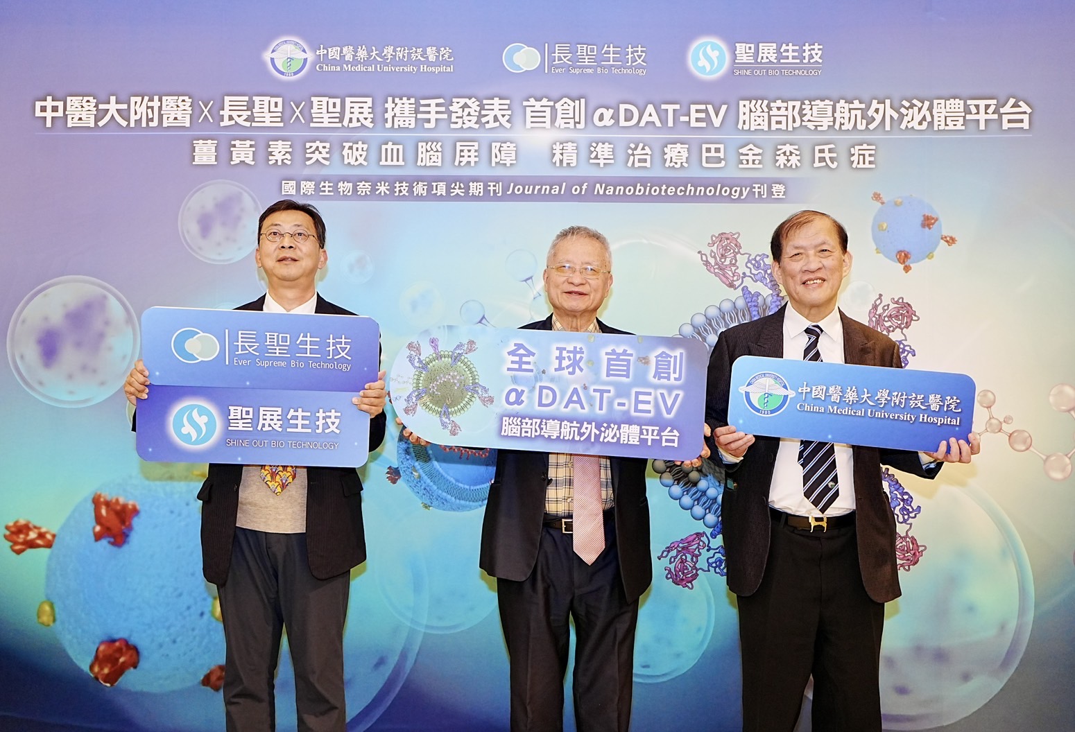 中國醫藥大學附設醫院(以下簡稱中醫大附醫)院長周德陽所領導的研究團隊攜手長聖生技、聖展生技,再度於外泌體藥物遞送技術上取得重大突破。繼成功開發針對實體腫瘤之HLA-G 標靶外泌體平台後,進一步將外泌體藥物載體技術延伸至高技術門檻的中樞神經系統(CNS)領域,成功開發出全球首創具主動導航能力的「αDAT-EV腦部導航外泌體平台」,能有效攜帶藥物主動穿透血腦屏障(BBB),並導向巴金森氏症(PD)相關受損神經區域,為神經退化性疾病治療開啟全新可能。此項研究成果已獲國際生物奈米技術頂尖期刊《Journal of Nanobiotechnology》接受刊登。