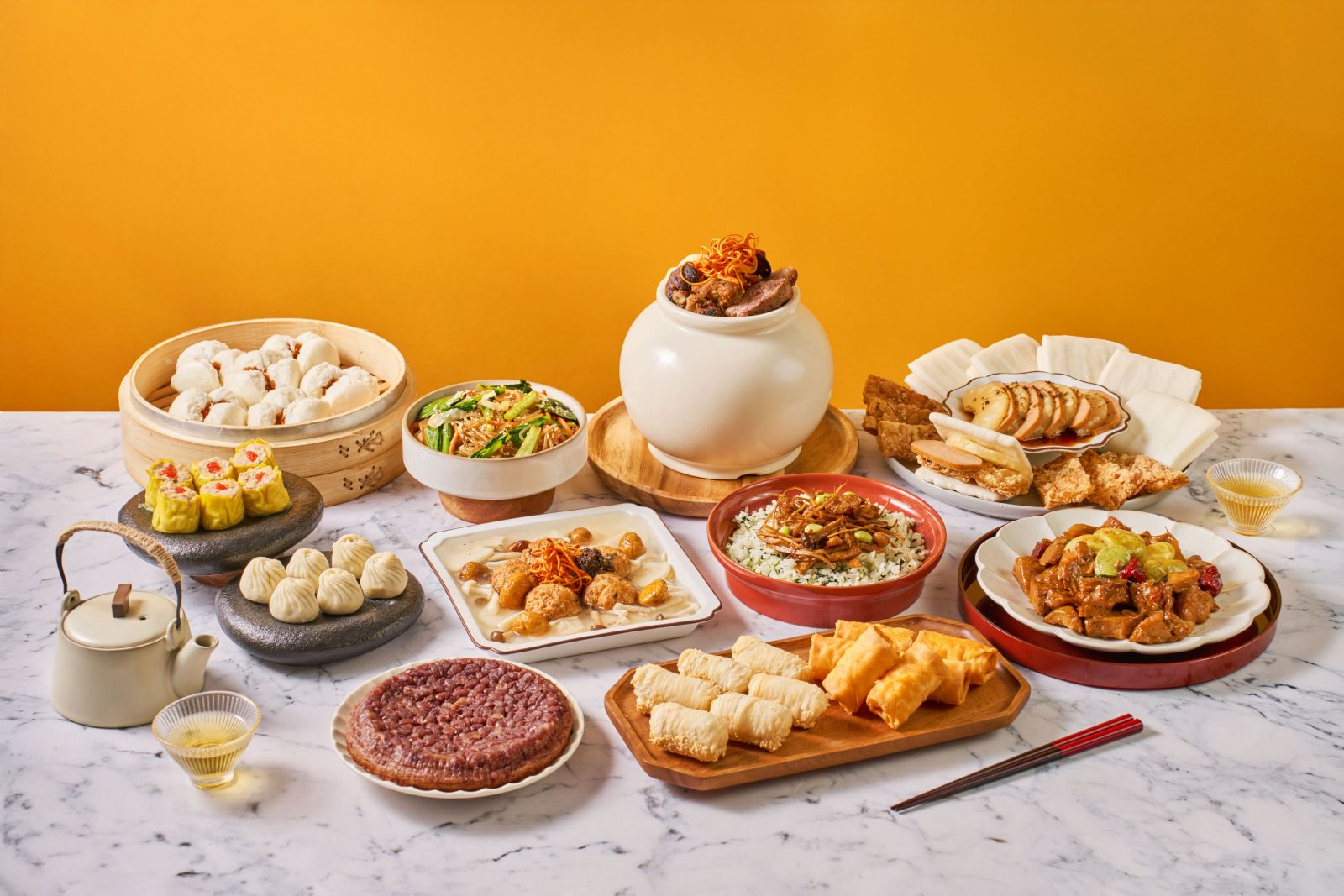主食部分包含鍋氣十足的「香芋蕈菇上海菜飯」,以及寓意招財的「旺來咬金蜜雙方」。此外,套組更內含兩款經典「港點雙拼」,從皮薄多汁的鮮蔬小籠包到香氣撲鼻的蘿蔔絲酥餅應有盡有。餐後則以象徵年年高升的「圓滿福禮糕」劃下溫馨句點。這套 12道精選料理的豪華組合,原價5,280元,現在預購即可享有5,016元的限時優惠價。