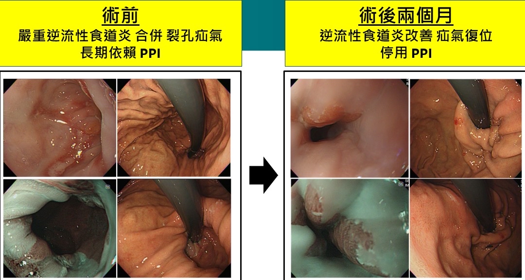 65歲的林先生因工作壓力大,應酬頻繁,導致三餐與生活作息不規律,長期飽受胃食道逆流困擾。平常他經常感到胸口灼熱、悶痛,與久咳不癒,每當用餐後彎身或躺下,症狀就會加劇,讓他吃不好、睡不好。經胃鏡檢查確認為嚴重逆流性食道炎合併裂孔疝氣,因此長期使用質子幫浦抑制劑 (PPI)治療,但在規則使用藥物之下,其症狀仍反覆發作且控制不佳。