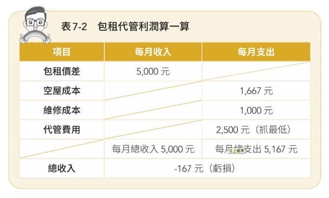 從表7-2即可發現,原以為每月能輕鬆賺5,000元價差,但扣除成本後,不但可能沒賺,還得倒賠167元。尤其上述尚未計算所投入的時間成本與所花費的精力,像是找租客、處理房客問題、物件開發、裝潢成本等,這些都會增加成本,壓縮利潤。知道了吧!這些才是多數人踏入「包租代管」後,經常遇到卻很少被告知的真實現象。