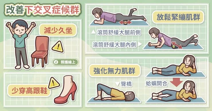 研究發現,女生比較容易患有下交叉症候群。建議可以減少穿著高跟鞋的時間,即使你穿高跟鞋走起來沒有什麼異狀,不會腳痛或走不順,但持續性穿高跟鞋的姿勢還是容易讓下半身的肌力失去平衡,更容易患有下交叉症候群。