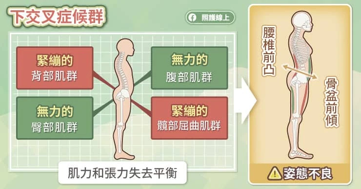 所以大家可以看看圖片,所謂的交叉就是這身體前後的兩個連線。由前方腹部肌群連到後下方臀部肌肉的部分變得肌力太弱,而前方髖部屈曲肌群到後上方的背部肌群張力太強。當這樣的不平衡持續存在的時候,我們身體的姿勢就會容易跑掉,變得骨盆前傾且腰椎前凸,常常有下背痛的困擾。