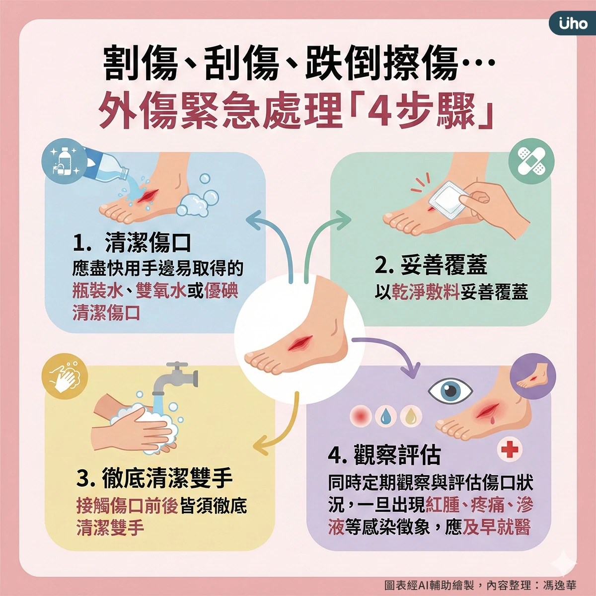 台北慈濟醫院護理部主任吳秋鳳表示,民眾若在年節期間不慎受外傷,當下可做的緊急處置步驟為: